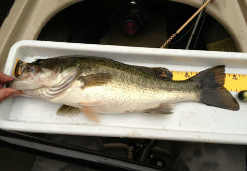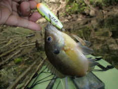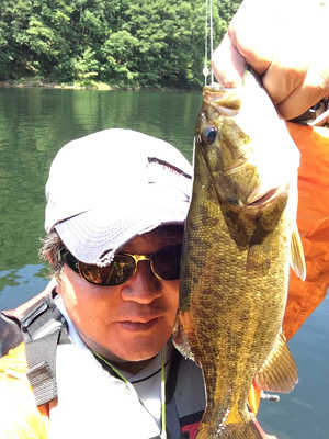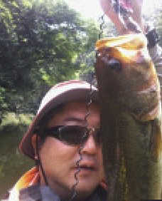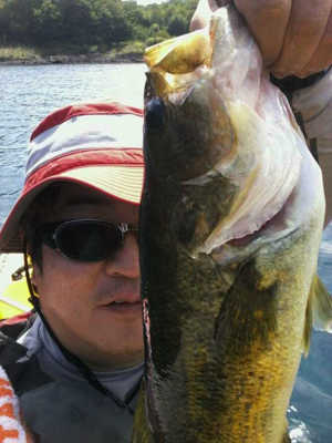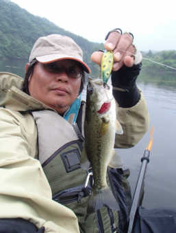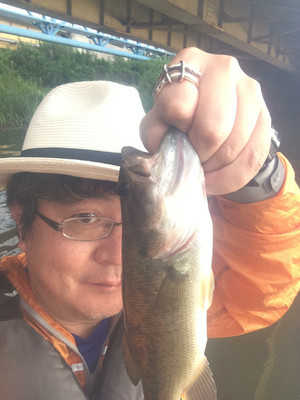 写真のバスは、長門川の鉄橋の下の護岸でボイルしていたのを、運よく釣ることができた30㎝くらいのバスです。ヒットルアーは、バグリーのマイティーミノーです。