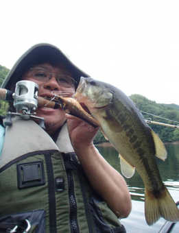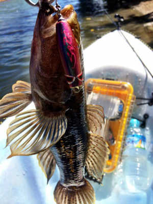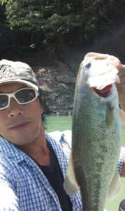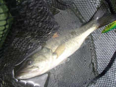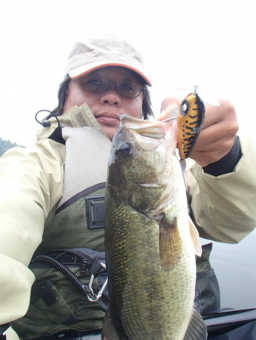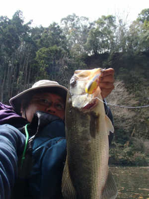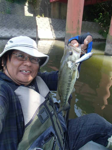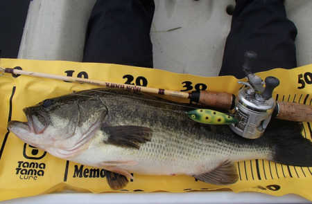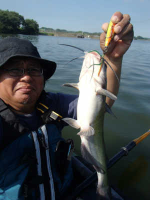 写真のバスは、長門川の鉄橋の下の護岸でボイルしていたのを、運よく釣ることができた30㎝くらいのバスです。ヒットルアーは、バグリーのマイティーミノーです。